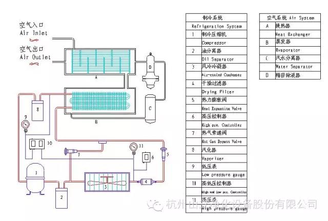 降低压缩空气的温度可减少压缩空气中的水蒸气含量,而多余的水蒸气会凝结成液体,再把液态水除去,从而使压缩空气达到干燥的效果。冷干机就是利用这一原理来工作的。