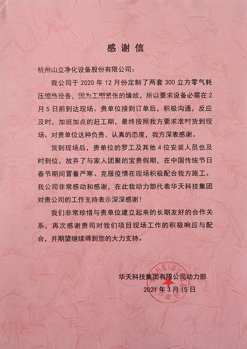 近日,杭州广东会净化设备股份有公司收到一封来自华天科技集团有限公司感谢信。信中,华天科技集团有限公司主要对我司的设备生产团队,售后服务团队的全力支持和协助表示感谢。我公司售后服务人员罗文博、王李、刘周洋和车间员工房立香、康等红,他们放弃了春节假期,冒着严寒加班加点,,积极配合客户安装施工,安全、高效、优质地完成了安装调试任务。他们勤奋敬业、踏实务实的工作精神,认真勤勉、专业务实的服务态度得到了客户的认可与感谢。