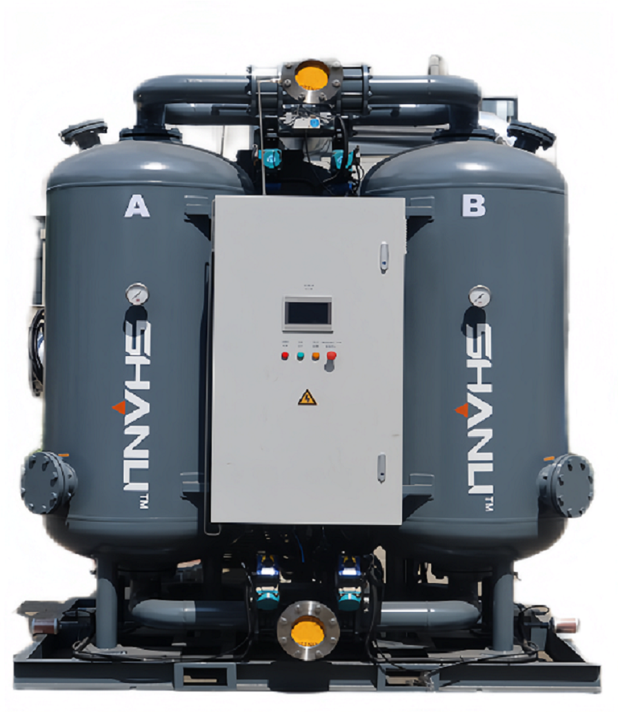 此方案通过对原设备系统基础耗气量的节能改造,彻底摒弃传统耗气模式,通过环境大气加热再生与高效热循环系统设计,实现全程无压缩空气消耗。具体运作中,利用鼓风机驱动热气在封闭回路内循环,经水冷换热器精准控温,确保吸附剂高效再生同时降低能耗,最终实现设备耗气量归零,显著优化空压站能效。